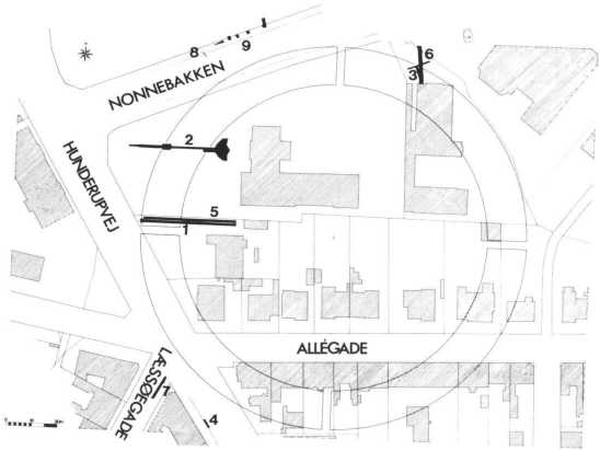 Fig. 5. Placeringen af undersøgelser, der er omtalt i teksten. 1. Søndergaard, fjernvarmegrøft, 1953. 2. Søndergaard, 1953. 3. Søndergaard, fjernvarmegrøfter, 1953. 4. Søndergaards to profilopmålinger af voldgraven (kabelgrøft), 1953. 5. Arentoft, fjernvarmegrøft, 1992. 6. Arentoft, fjernvarmegrøft, 1992. 7. Arentoft, fjernvarmegrøft, 1992. 8. Jensen & Sørensen, kabelgrøft, 1988. 9. Arentoft, kabelgrøft, 1988. (Nielsen/Kristensen del., rekonstrueringen af anlæggets beliggenhed i terrænet skyldes oprindeligt Holger Schmidt.)