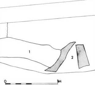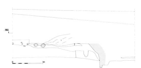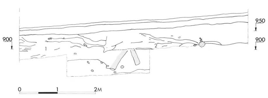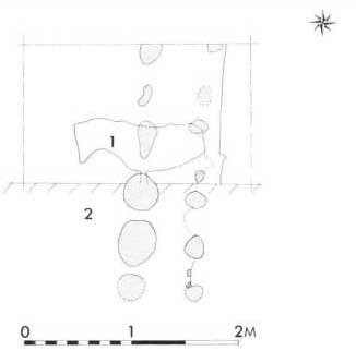 Fig. 6. Profilopmåling visende den indvendige voldfront. Set fra syd. Prikket = stolpespor. 1. Tørv i volden. 2. Nedskredne tørv udenfor volden. (Arentoft mens., Kristensen del. ).