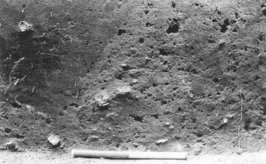 Fig. 16. Bræmme af sten liggende mellem escarpen og den lodrette yderfront. (Møntergården foto, 13. juli 1992).