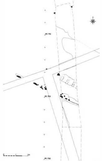 Stolpesporene, der for den inderste rækkes vedkommende står svagt og kun til dels er til at skille fra den omgivende fyld, står begge skråt, således de peger ind mod hinanden. Stolpesporene stod så svagt, at det kun var muligt at se den ene række af dem i fladen. Iagttagelsesforholdene var nu heller ikke de allerbedste, for de nye fjernvarmerør var allerede lagt, så der måtte graves nedenunder dem med en frihøjde på kun en halv meter. Tegner man disse stolpespor sammen med dem, Søndergaard afdækkede i 1953, ligger de nok så nydeligt i forlængelse af hinanden, og der er næppe tvivl om, at det (eller de) manglende spor også har været der.