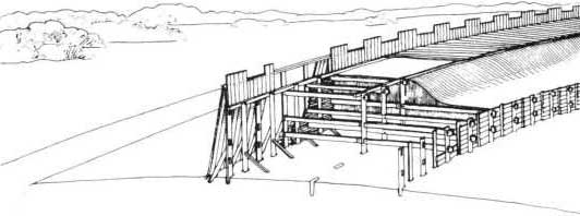 Fig. 12. Forsøg på rekonstruktion af Fyrkat-voldens opbygning. Den lodrette yderfront og escarpen genfindes på Nonnebakken, mens sikre spor efter skråstivere til yderfronten ikke er fundet. Til gengæld har Nonnebakkens lodrette inderfront haft en række af skråstivere, som ikke ses på Fyrkat. En lignende, indvendig skråstiverrække var der også på Trelleborg. (Efter Olsen & Schmidt 1977: 69).