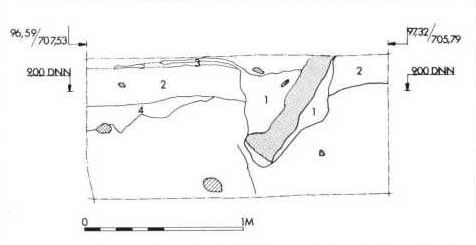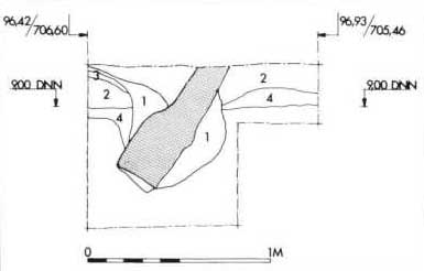 Fig. 17. Snit i voldgraven under fortovet nord for Nonnebakken. Næsten helt nede i bunden sidder en lang knogle i profilen. Den tilhører et hundeskelet, som af Tove Hatting på Zoologisk Museum er bestemt som værende af en stor hund med en skulderhøjde på 76 cm. Racen har lignet en Broholmer: Skelettet lå i teglfri lag, men del er tvivlsomt, om det er helt fra borgens funktionsperiode. (Møntergården foto, 18. maj 1988).