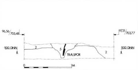 Af de to stolpespor, der kunne ses i profilen, hælder det inderste (regnet fra borgcentrum) ca. 22° ind mod volden, mens det yderste hælder ca. 28° væk fra volden. Det var ikke muligt at se noget stolpehul til disse stolper – kun sporet efter selve træstolpen (der er visse tegn i Søndergaards opmålinger på, at begge stolperækker er nedsat i én bred grøft). Begge stolper stod i en særdeles hård, leret sand med småsten – næsten stabilgrusagtig i sin karakter. På voldsiden af den yderste stolpe var der dog sort tørvefyld næsten ned til bunden af den. Lignende forhold er i ganske kort afstand herfra set i 1953. Adskillige skrå stolpespor er registreret, men særlig én profilopmåling viser næsten identiske forhold, fig. 9. Både stolpernes skæve stilling, hvor de peger ind mod hinanden, den hårde stenede fyld mellem dem, samt tørvefylden på voldsiden af den yderste stolpe er ens.