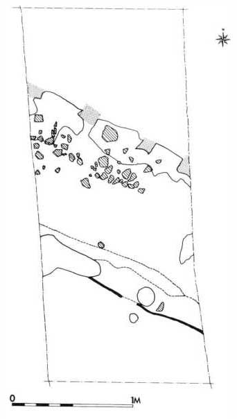 Fig. 14. Fladetegning visende en bræmme af mindre sten (skrå skravering), der ligger mellem den lodrette yderfront og escarpen i skolegården foran Giersings Realskole. Stenene er formentlig faldet ned, da frontens træbeklædning (tyk, sort streg) efterhånden rådnede bort, men inden jorden for alvor skred. Med prikket signatur er vist nogle kantede hak i den opgravede ler fra escarpegrøften – det viste sig at være escarpestolperne. (Madsen/Arentoft mens., Kristensen del.).