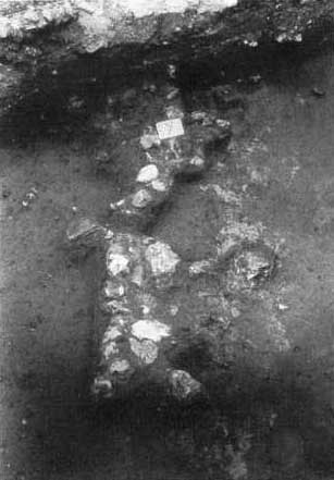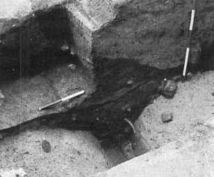 Fig. 8. Stolpehullerne fra fig. 6, set fra syd. Skråstiveren til højre har støttet den lodrette inderfront, som imidlertid på et tidspunkt alligevel har givet efter for trykket og er presset ud til højre. Fylden mellem de to stolper er særdeles hård – en ting udgraverne i 1992 fik at mærke, og som også Søndergaard bemærkede i sine notesbøger. Den lader sig kun med besvær grave med graveske. (Møntergården foto, 31. marts 1992.).