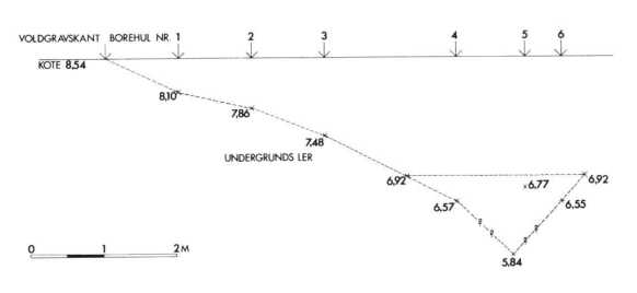 Bundkoten kan heller ikke anføres. I borehul 4 og 6 ramtes undergrunden i hhv. kote 6,57 og 6,55. Fortsætter man skråningerne med 45° hældning fra disse punkter, indtil de mødes, ligger spidsen i kote 5,84. Da 45° hældning imidlertid er for meget, idet boreprofilen ikke ligger radiært på voldgraven, bliver den sande bundkote altså et sted mellem 6,55 og 5,84. En opgivelse omkring kote 6,00 er nok ikke helt ved siden af.