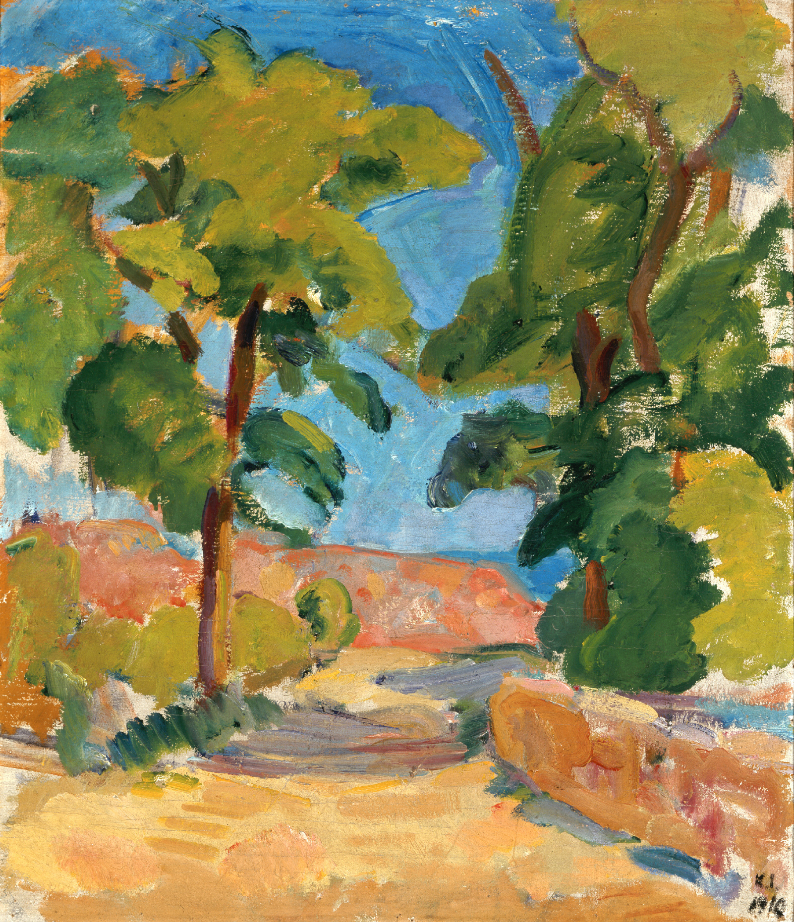 Det nyerhvervede landskab af Isakson (fig. 1; katalog nr. 12) er signeret og dateret K. I. 1910. Dets komposition er ganske enkel. Henad en dels rødligt solbeskinnet, dels violet beskygget vej mellem løvrige, grønne træer, ser man midt i billedet imod lave, grårøde klippeformationer og det åbne, strålende blå hav. Det midtpunktsøgende, perspektiviske i opbygningen fremhæves af farven, som både nedenfra og ovenfra stiger i lysintensitet, afskærmet til siderne af det grønne, for at nå sit højdepunkt i horisontlinien. Komposition og farve er ét.