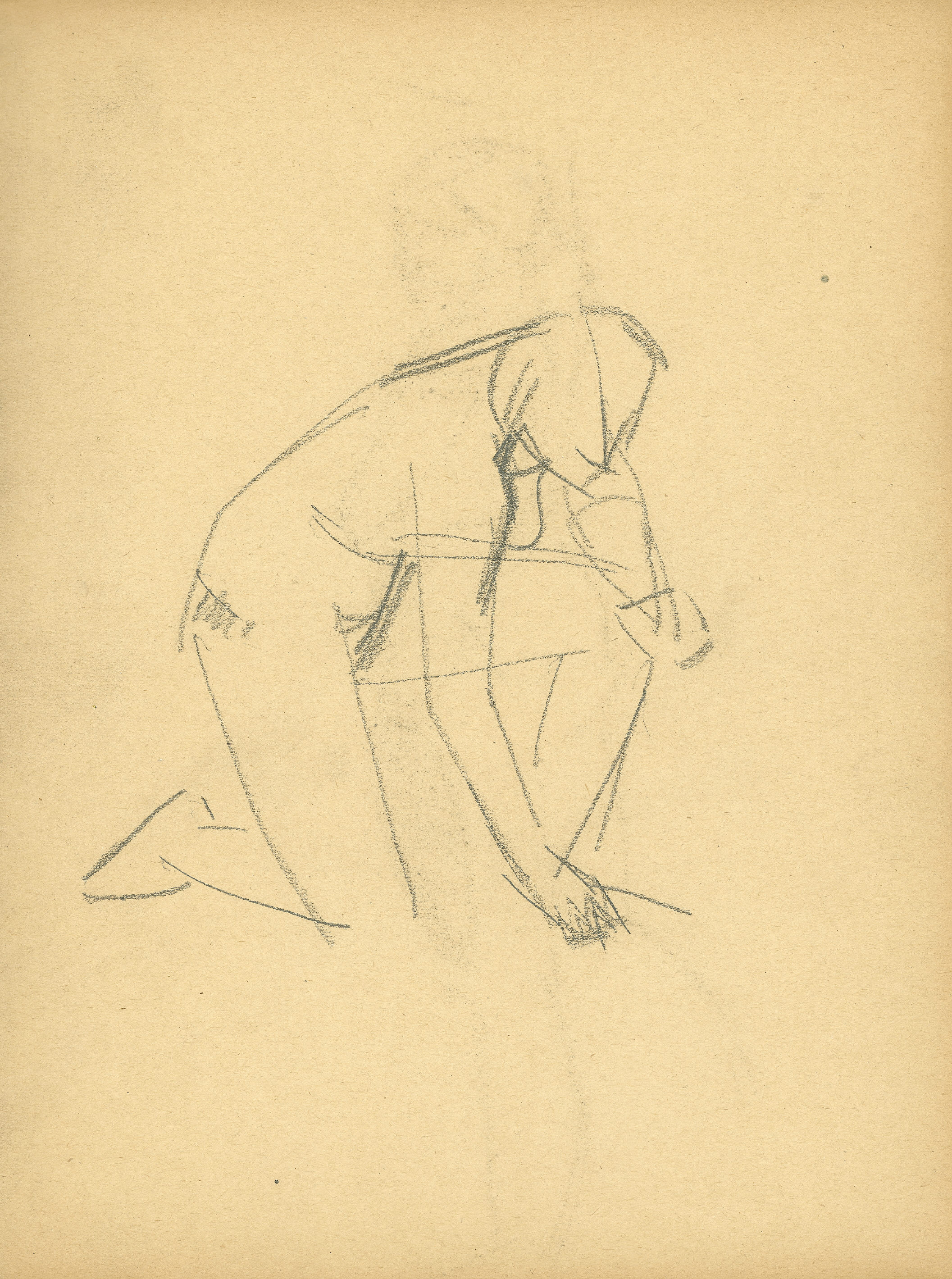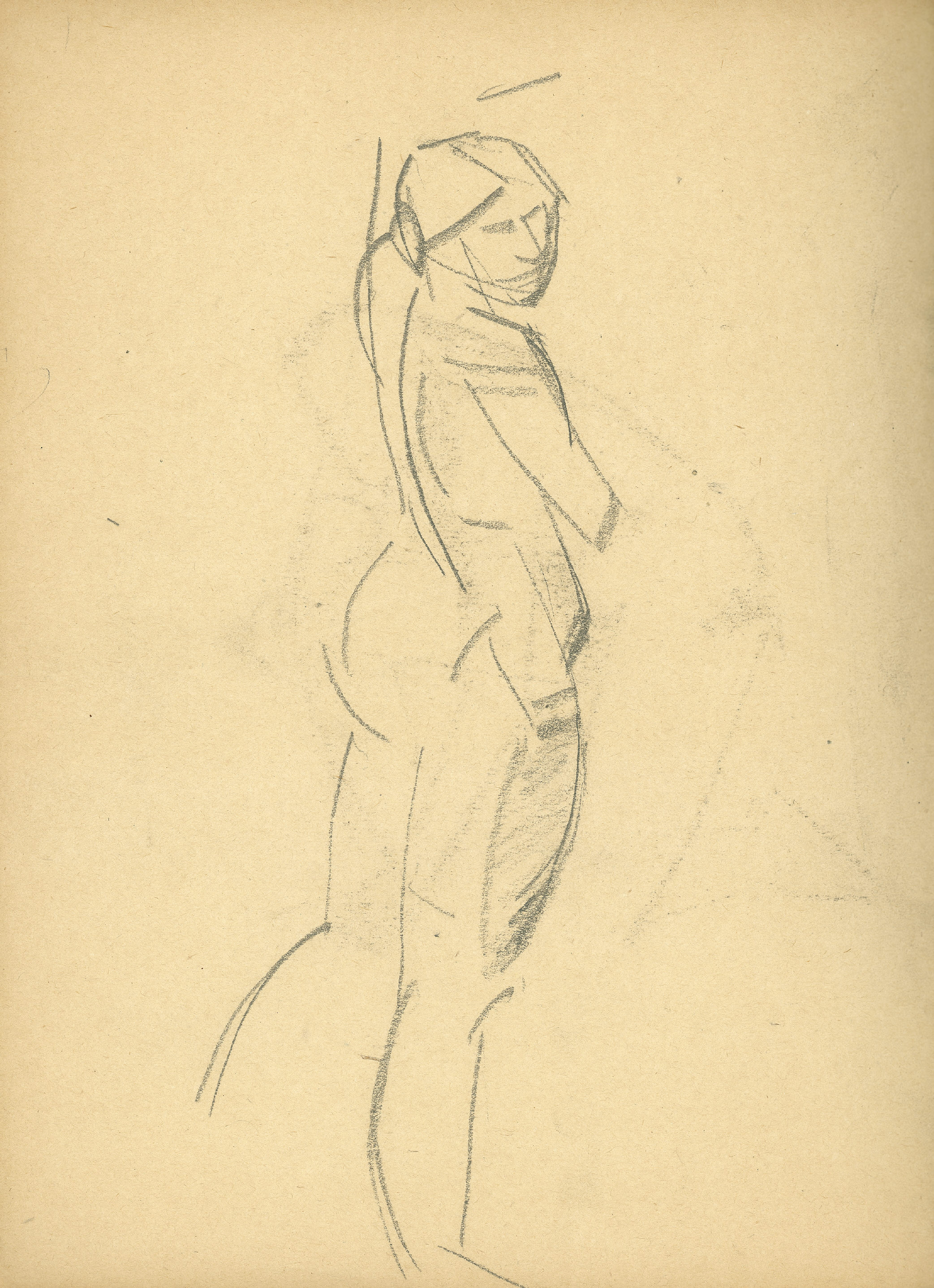 Blandt de tegninger af Karl Isakson, som museet har modtaget som gaver fra Ny Carlsbergfondet, skal en skitsebog indeholdende 17 modelstudier først nævnes (fig. 2; katalog nr. 11). Den står to skitsebøger i Den kgl. Kobberstiksamling meget nær og må være samtidig med disse, der tidsfæstes til Isaksons første ophold i Paris 1905-07.[12] Under dette lange ophold malede og tegnede Isakson på Académie Colarossi, men af akademisk skolearbejde af sædvanlig art er der ikke meget at finde i disse skitsebøger. I sine studier efter både mandlig og kvindelig model har han ikke søgt mod løsningen af noget specielt problem, men med frodig hånd og ligesom ført af en kun halvt bevidst strøm har han fantaseret over nogle motiver, som interesserede ham. Studierne beskæftiger sig med det elementære i de ofte usædvanlige stillingsmotiver, som er indfanget med hurtige men præcise streger.