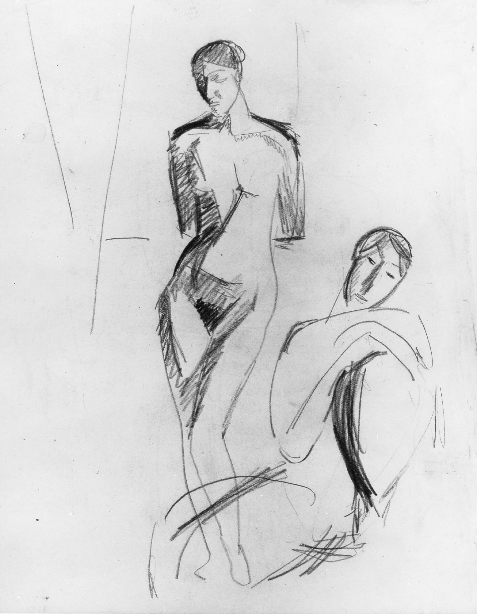 Denne omskrivende metode kendes også fra Isaksons sene malerier og ses med særlig skønhed og klarhed i museets stående kvindelige model fra 1918-20. I hvert enkelt af sine sene malerier tog Isakson bestemte problemer op, der næsten altid var stillet udfra et koloristisk grundsyn. Han førte billederne så langt frem, at hans spørgsmål var undersøgt eller gennemprøvet, som han ønskede det. Om at fuldende dem i sædvanlig forstand var der ikke tale. I mange tegninger fra denne tid, ikke mindst i dem, der beskæftigede sig med kvindelig model, skærpede Isakson sin fornemmelse for den lineære fasthed i kompositionerne, som altid ligger bag maleriernes tilsyneladende omtrentlighed. En sådan tegning (fig. 3; katalog nr. 13) er skænket museet af Ny Carlsberg-fondet. Ved sin klare forenkling og faste, kraftfulde streg gør Isakson rede for figurernes opbygning. Den summariske skravering af de beskyggede partier i den stående figur ligesom afklarer de rumlige problemer én gang for alle, så at Isakson i malerierne kan arbejde videre med en rent farvemæssig fortolkning af dem uden at miste den forankring i synsindtrykket, hvorpå hans kunst i så høj grad bygger.