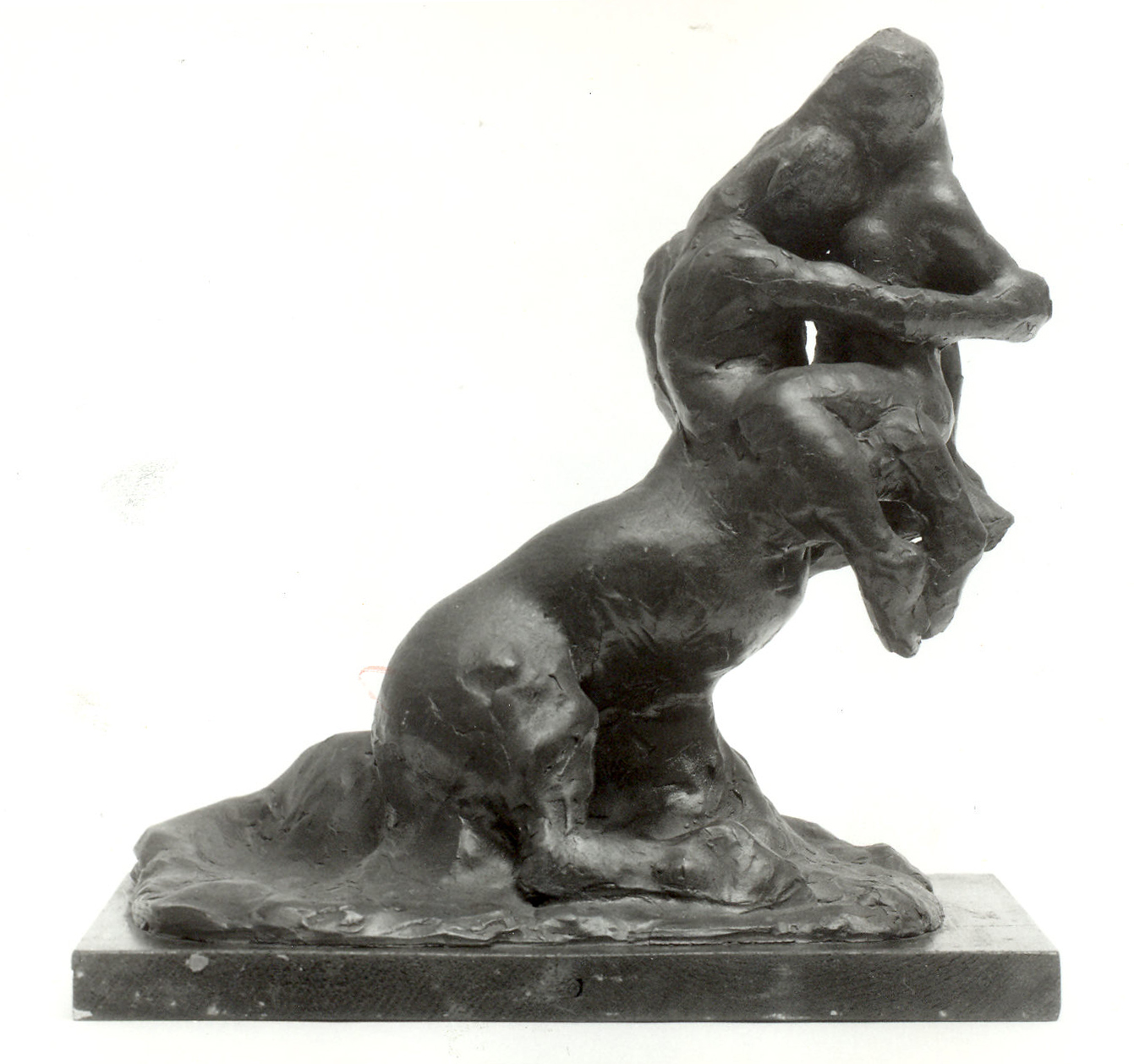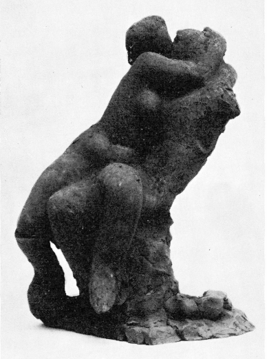 En næsten endeløs række af små frit og spontant gjorte udkast til grupper med en mandlig og en kvindelig figur fra årene efter „Liggende pige“ blev fuldført i 1914 frem til midten af 1920’erne, er også langt større i indhold og muligheder, end de er som fysiske genstande. I disse grupper er de to figurer bundet sammen ved en handling, ikke en litterær men en rent skulpturel, selvom motiver og titler i mange tilfælde skyldes læsning af Ovids metamorfoser. Figur virker på og sammen med figur, varmen og det sanselige, der opstår ved tæt samvær, gør disse små grupper til betydelig kunst. Der er over en kærlighedsgruppe i Odense (fig. 8)[23] noget ustabilt, som man føler må søge at falde til rette, men som endnu er spændt af flere muligheder. Denne henholdende komposition modsvares af den lille skulpturs forførende stoflighed. I det mildt grå ubrændte ler har modellerpinden sat spor, der beriger overfladens mathed, fanger lyset og giver den et dirrende liv. Både denne overflade og kompositionens ustabile ligevægt peger mod Rodins værker, ikke mindst mod den store gruppe „Kysset“ fra 1886, som Henning udmærket kendte i Glyptotekets marmoreksemplar fra 1902.[24] Rodin var den billedhugger, som havde størst betydning for Henning, i hvert fald indtil Maillols klassicisme i anden halvdel af 1920’erne gør sig mere og mere gældende samtidig med, at Henning selv gik over til fortrinsvis at arbejde med store formater.