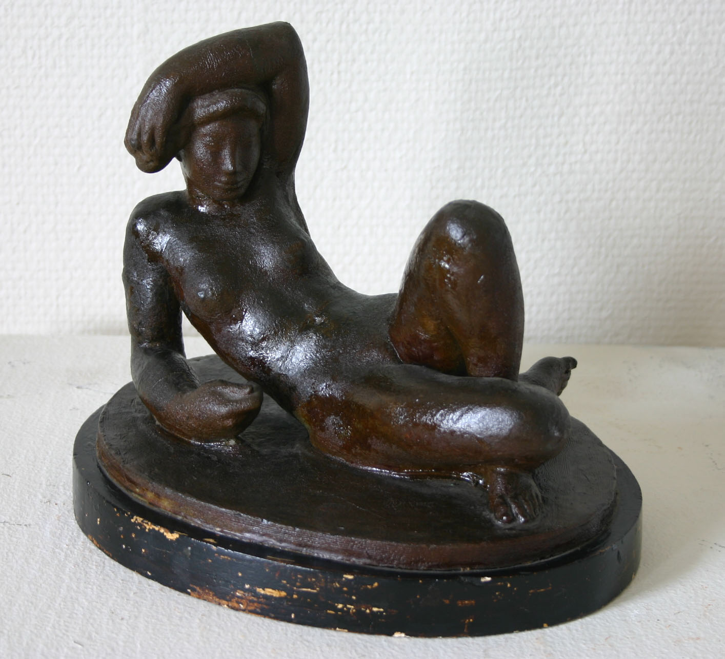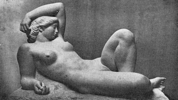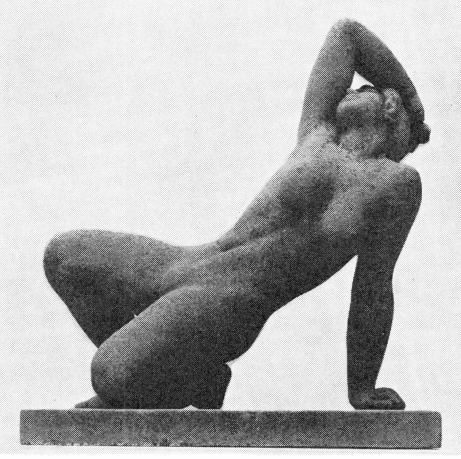 I Gerhard Hennings produktion indtager statuetten „Liggende pige“ fra 1913-14 en ganske særlig plads (fig. 6).[18] Den blev til efter lang tids kredsen om motivet, der har en tradition fra den hellenistiske Ariadne i Vatikanet over Michelangelos fremstillinger af døgnets fire tider på Medici-gravene i Firenze og videre til samtidige værker. Kun Hennings nære ven Kai Nielsens ivrige tilskyndelser fik ham til at overvinde anfægtelser og vanskeligheder. Ikke blot skylder vi Kai Nielsen tak, fordi statuetten nåede det første og på en måde endelige trin i det originale vokseksemplar, som museet i Odense nu har påtaget sig at sikre for eftertiden, men også for, at den blev støbt i flere eksemplarer i mere modstandsdygtige materialer som bronze og brændt ler.[19]