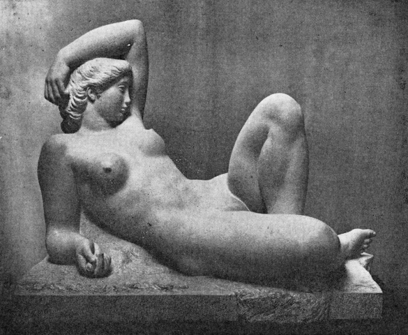 Det skulle vise sig, at figuren fra 1914 kun var en begyndelse, og at meget skulle udvikle sig af den. „Liggende pige“ er monumental skønt kun lille, fordi den plastisk set er ganske enkel. Kurve føjer sig naturligt til kurve, formelement til formelement, og helheden synes større end summen af de enkelte dele. Den hvilende stilling er rolig, uflyttelig, den synes indtaget for evigheden, men mangler måske lige det pust af liv, som gør Hennings andre småskulpturer så tiltrækkende. Den lille figurs selvfølgelige storhed kom til at spille en rolle for begge de to venner Gerhard Henning og Kai Nielsen. For Kai Nielsen blev „Liggende pige“ af stimulerende betydning ved arbejdet med de store liggende kvindefigurer „Leda uden svanen“ fra 1920 og „Opvågnen“ fra 1923-24, som begge er storværker i dansk billedhuggerkunst og tillige frugter af deres ophavsmands særegne og af barokken dybt påvirkede kunstnerpersonlighed.[20] Henning selv opgav ikke motivet fra „Liggende pige“, som blandt andet genfindes i studietegninger fra 1920’erne.[21] Først i 1942-43 nåede Henning det afgørende i sit arbejde med dette smukke motiv, da han modellerede sin „Liggende pige“ i stort format. I 1943 blev statuen for første gang støbt i bronze på Albertina-fondets bekostning og prægtigt opstillet i anlægget mellem Grønningen og Kastelsgraven i København. Det sidste ord blev dog ikke sagt før Henning i 1948-50 selv huggede det overmåde skønne eksemplar i fransk kalksten, som tilhører Ny Carlsberg Glyptotek (fig. 7).[22] Denne statue er intet mindre end en bedrift og måske Gerhard Hennings mesterværk. Det er den aldrende mesters fuldendelse af en uforglemmelig idé fra ungdommens dage. Forskellene imellem den lille og den store liggende pige lader sig begribe udfra den modning som kunstner, Henning gennemgik i de mange år fra 1913 til 1950, uden at det inderste i hans holdning til skulpturen ændredes. Kun ved nøje sammenligning mellem de to skulpturer bliver man klar over, hvor stor forskel der egentlig er mellem dem – heldigvis, tør man sige, til den stores fordel. Først i den store figur folder den liggende pigeskikkelse sig ud i hele sin iboende fylde; i den lille føles skikkelsen lovlig snævert begrænset indenfor det ovale fodstykke. Først i den store figur har det dejligt rejste hoved og den hævede venstre arm den fulde balance i forhold til det hævede venstre og det hvilende højre ben; i den lille føjer lemmerne sig en smule kejtet og linievirkningerne klinger langt mindre frit. Til trods for disse indvendinger er statuetten fortrinlig skulptur, og dens ikke uvæsentlige fortrin fremfor den store er de tusinde muligheder, den ses at indeholde, og som vi glæder os over at vide blev til virkelighed.