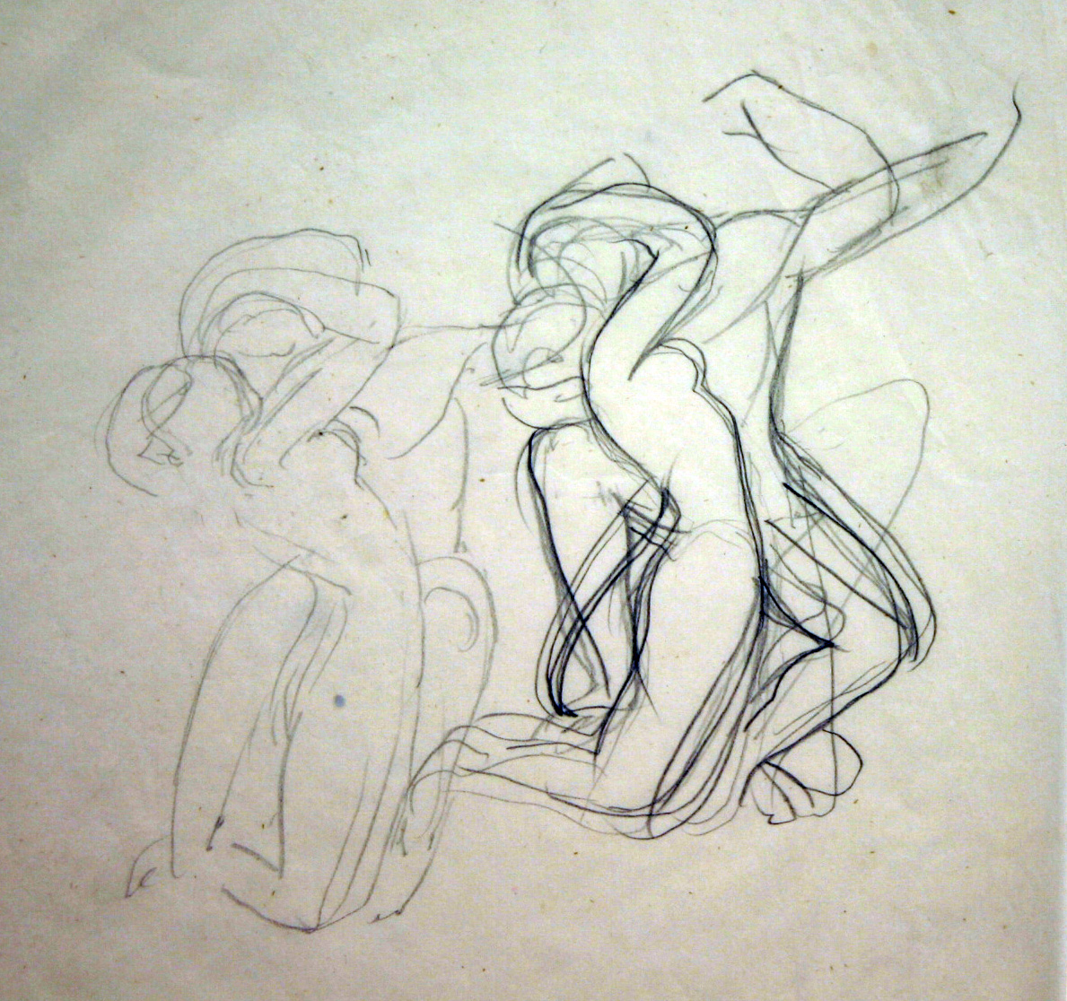 Helt af samme art som de små skulpturudkast fra 1920’erne er de samtidige tegnede skitser. Et blad i Odense har to studier, der er nært beslægtede med den lille lergruppe fra 1923 kaldet „Pygmalion og Galathea“ (fig. 9).[25] I forholdet mellem den ganske lette skitse til venstre og den mere udarbejdede til højre fornemmer man, at der er tale om et forarbejde til en skulptur. Det er det klare overblik i de to figurers lidenskabelige samhørighed, gruppens plastiske helhed og den rytmiske sluttethed, som Henning søger frem imod og når. Som tegning betragtet finder man de største værdier i linieføringens elegance og sikkerhed og i selve blyantsstregens rige variationer fra ganske let gråt til sort.