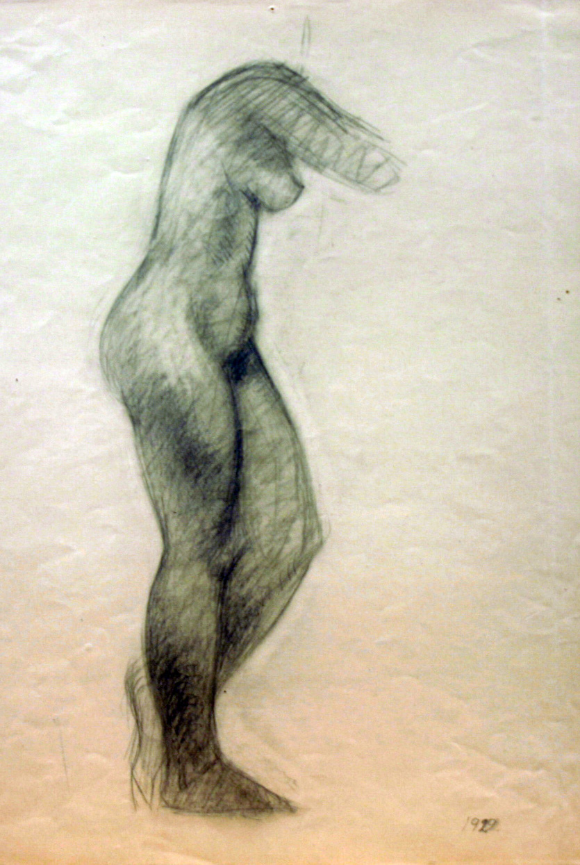 En blyantstegning fra 1929 (fig. 11) viser selve fundamentet under såvel dette motiv som under Hennings kunst i det hele taget: modelstudiet.[29] Aldrig udtømte Henning naturen. I denne kilde fandt han bestandig nye og friske træk, og uafladelig måtte han sikre sig, at gjorte iagttagelser var holdbare. Det skete egentlig aldrig i tvivl og anfægtelse, kun kærlighedsfuldt og med stigende indlevelse og erfaring. Men at opbygge sine kunstværker blot som en sum af sete bestanddele var ham ligeså fjernt. Hennings mageløse sans for formers og liniers rytme, hans klare opfattelse af kunstværket som en egen eksistens, og ikke mindst hans varme, sensuelle sind står altid som formidlende led imellem naturen og Hennings arbejder.