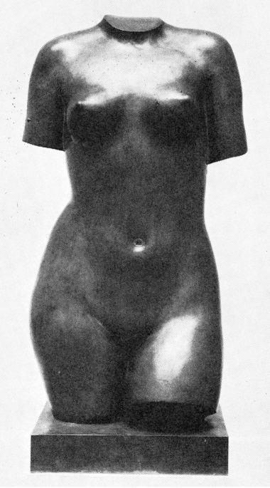 Heldigvis kan Fyns Stifts Kunstmuseum også vise en af Hennings monumentale, stående kvindefigurer. Det er den smukke torso i gyldenttonet bronze fra 1948 af den allerede i 1943 som fuldstændig figur skabte „Blomsterpige“ (fig. 13).[37] Den rankt stående kvindeskikkelse står i gæld til Maillol’s „Pomona“ fra 1910 både ved sit motiv og ved sin sikkert disponerede, glidende overføring af hele kroppens vægt til det ene ben.[38] Men det smukkeste ved denne torso er Hennings eget: Den roligt bårne rytme, som i eet og alt er bestemt udfra figurens enkle og klart definerede bevægelse.
