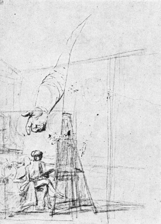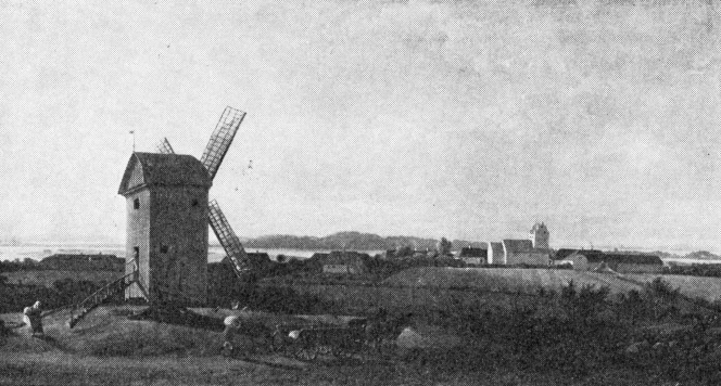 Juel har malet den vide udsigt fra Gamborg møllebakke over det dejlige, fynske landskab med møllen, kirken og de store gårde mod Lillebælt, Fønshalvøen og den jydske kyst (fig. 7). De store, rene linier er endnu ikke, som nu, udslettet af træers mængde. Det lille hus til venstre for kirken er degneboligen, Jens Juels barndomshjem. Billedet er malet efter hans hjemkomst 1780 fra den store rejse, vel i 1790’erne (ikke 1764, som hos Glarbo). En udsigt fra Marienlyst over Helsingør med Kronborg, Sundet og den svenske Kyst er malet som pendant, skønt Ramdohr docerede, at den ikke kunne males[11]. Gamborglandskabet har en påfaldende lighed i kompositionen med Brueghels landskab med møllerne og den vide udsigt i Palazzo Spada i Rom. Juel må have følt det, i 1775-76, midt i alle Roms overvældende rigdomme, som noget hjemligt og fortroligt – akkurat ligesom det, i 1844-45, fremfor noget i Rom vakte Lundbyes glæde og begejstring, gang på gang udtrykt både i dagbogen dernedefra – og i billeder efter hjemkomsten med Kalundborgmøllerne som motiv.