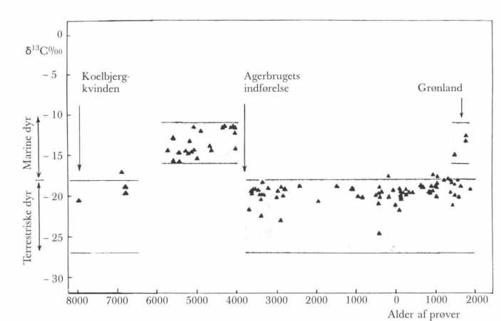 I de senere år er det blevet almindeligt at kalde hele perioden før agerbrugets indførelse for jægerstenalderen, i modsætning til den efterfølgende bondestenalder. Den betegnelse passer fint på Maglemose Kulturens folk, hvor til Koelbjerg-kvinden hører. Men C-13 målinger på et stort antal menneskeskeletter fra vor forhistorie4 viser, at betegnelsen er ret så misvisende for den seneste del af perioden. For da havet for alvor begyndte at stige omkring 6000 f.Kr. og ændrede det tidligere fastlandsområde til et fjordlandskab endnu mere udpræget end det, vi kender i dag, flyttede befolkningen ud til kysterne og skiftede erhverv og levevis, så fisk og havdyr (sæler) blev den helt dominerende kost (se Fig. 2). Ja, C-13 og C-14 målingerne viser, at i ca. 2000 år, fra omkring 6000 f.Kr. til 4000 f.Kr. med Kongemose Kultur og Ertebølle Kultur, var befolkningen i Danmark lige så afhængige af kost fra havet, som Eskimoerne på Grønland var før kontakten med Europæerne. Denne periode kunne derfor passende kaldes fiskerstenalderen efter det dominerende erhverv, og Danmarks stenalder burde ifølge disse målinger rettelig inddeles i en jægerstenalder, en fiskerstenalder og en bondestenalder. Det er det vigtigste resultat, der er kommet ud af målingerne af C-13 indholdet i forhistoriske skeletter, hvoraf Koelbjerg-kvinden er det foreløbigt ældste.