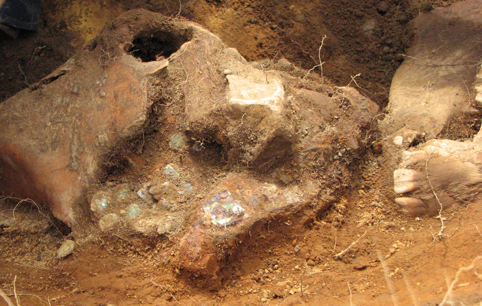 Hestekranium med dele af det dekorerede seletøj fra Ingiridarstadir in situ.