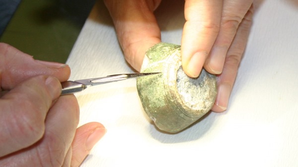 Nænsom skalpel-afrensning under mikroskop af et vægtlod i kobberlegering.
