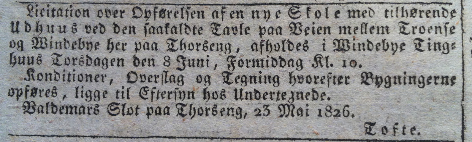Hvor mange bud, licitationen medførte, vides ikke, men i hvert fald blev der givet bud både på en bindingsværksbygning og på en skolebygning i grundmur. Blandt dem, der gav tilbud, var murermester Frederik Valentin i Troense, som også havde lavet tegningen, der skulle ligge til grund for byggeriet.[4] Der var tilsyneladende ikke særlig stor forskel på prisen for de to bygningsløsninger, og i et brev til kammerherre Juel skrev amtsprovst P.A. Wedel, ”Da Muur er saa meget at foretrække for Bindingsværk […] tillader jeg mig […] at formene, at Ingen kan have noget at vende imod, at den ny Skole paa Thorseng opføres af Grundmuur.”[5] Og således blev det.