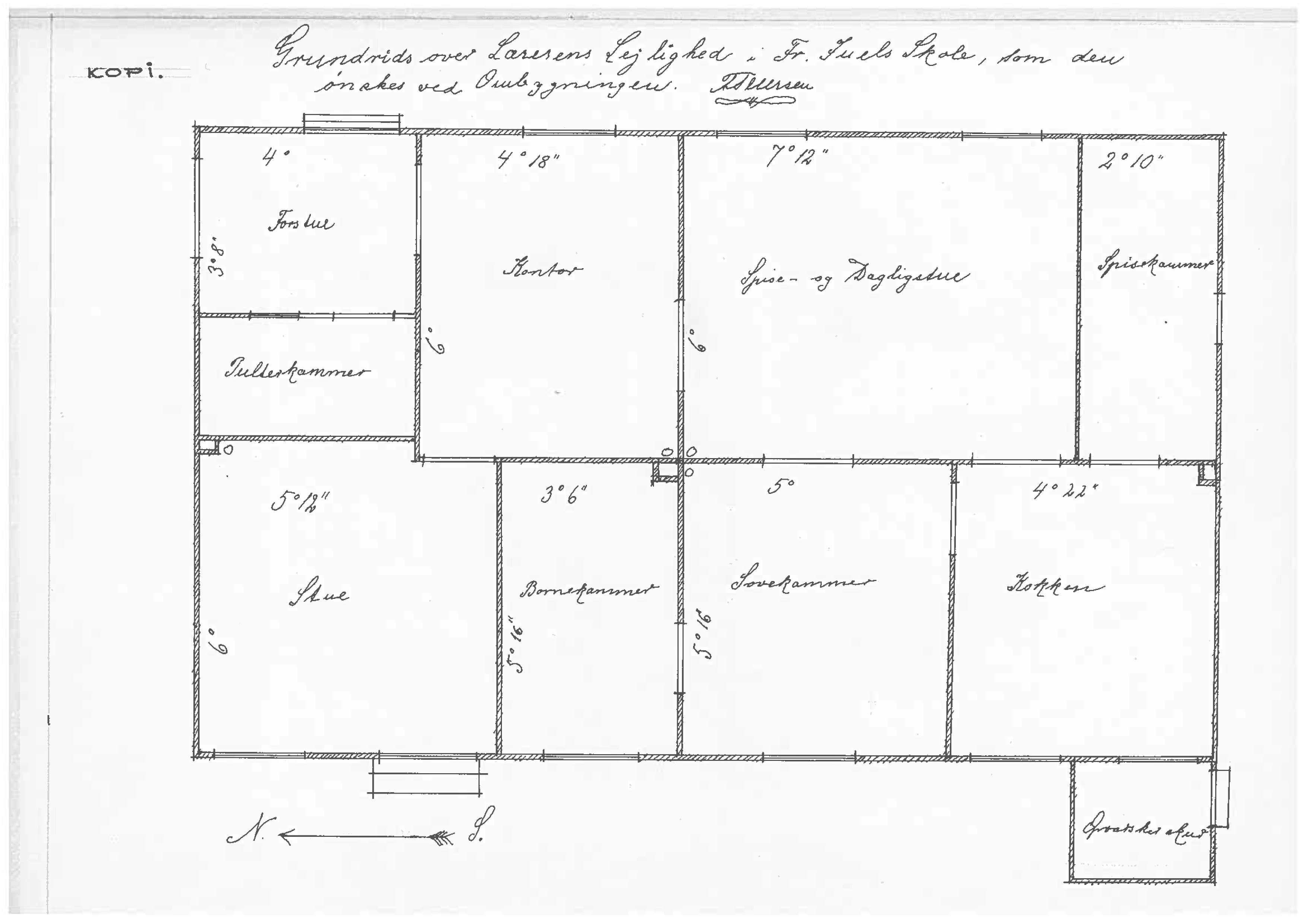 ”En Længde øster og vester, sønden for Skolen, 4 Fag dyb 9½ Al. Ege Fod, Fyrre Under og Overtømmer, Væggene murede deels af raae deels af brændte Steen, Straatag, 1 Skorsteen, med Loft, Dørre, Vinduer, Ovn, indrettet til Bryggers, Mælkestue, Kjelder og Kammer.”[7]