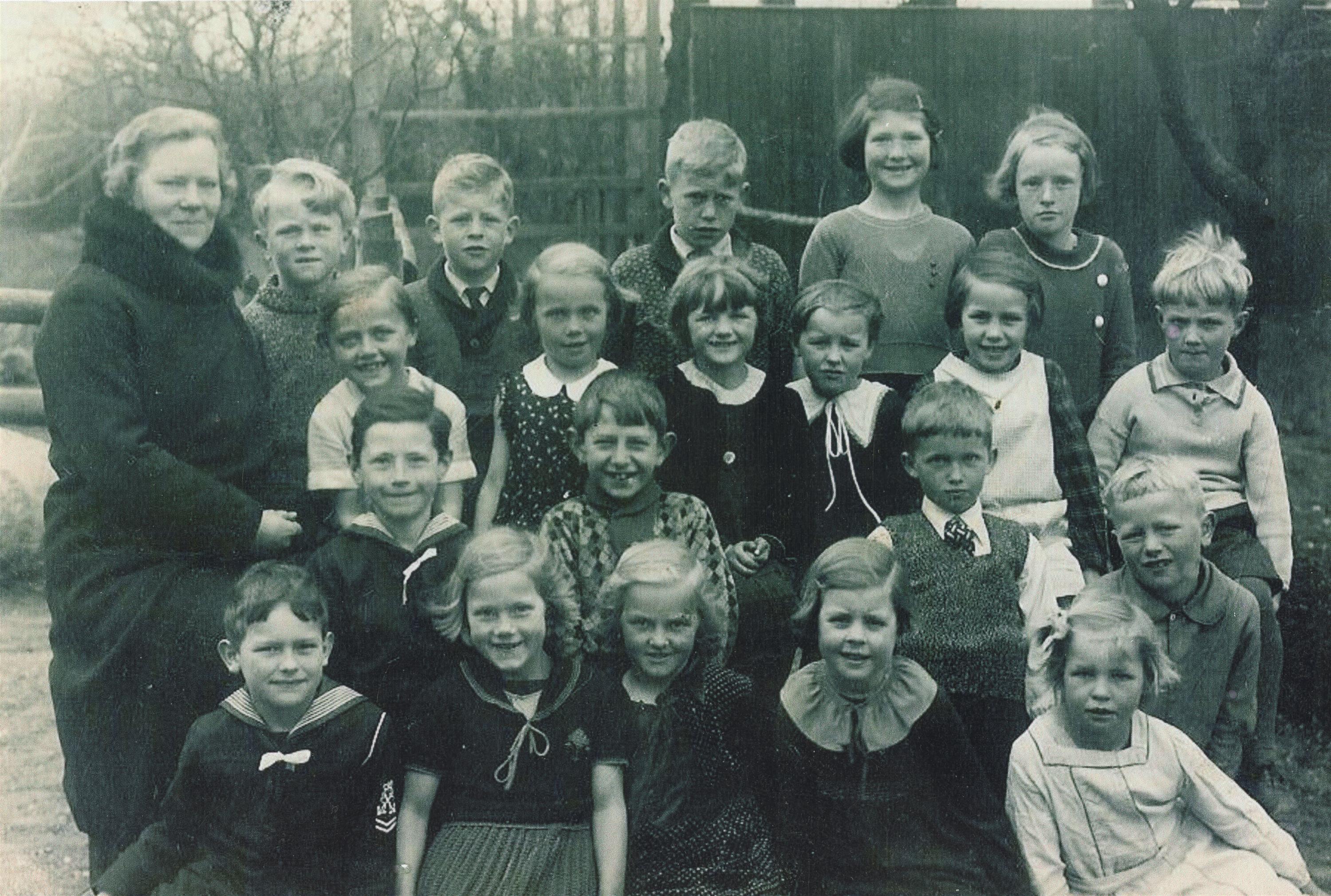 ”… dansk, regning, danmarkshistorie, geografi og bibelhistorie og hvis vejret tillod det, fik vi også undervisning i at spille rundbold på den grusbelagte legeplads om sommeren. I disse tre skoleår blev undervisningen altid afsluttet klokken 16:00 med en sang og at vi sammen bad et fadervor.”[40]
