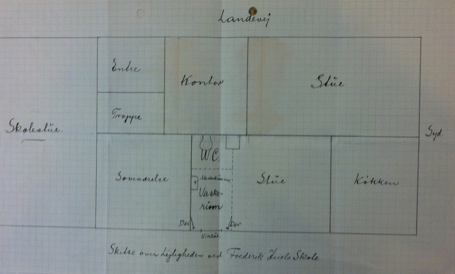 Alfred Odmand Jørgensen var født på Langeland, men var timelærer ved Odder Skole, inden han fik fast embede i Eskær. Han var i 1933 blevet gift med Anna Johanne, og sammen flyttede de ind i lejligheden på Frederik Juels Skole i 1935. Oven på den lidt hårde ankomst måtte Alfred love sin kone, at de kun blev på Tåsinge de fem år, man var nødt til at blive boende for at få flyttegodtgørelse, når man skulle flytte. Uden den havde familien nemlig ikke råd til at ”rykke teltpælene op”, skriver Odmand Jørgensen selv i sin langt senere beretning. Men familien blev nu boende i Eskær – og den blev forøget: først kom Henning til (i 1936), siden Ove (i 1938), så Jacob (i 1940) og til sidst Lars (1947). Skolelærerlejligheden er i dag i Den Fynske Landsby indrettet med legefaciliteter til museets små gæster – og er jo desuden noget mindre end dengang pga. forkortelsen ved genopbygningen (se ovenfor), så det kan være svært at forestille sig rummene som rammen om et familieliv med fire børn. Vi kan dog få et indblik i, hvordan lejligheden dengang var indrettet via en ansøgning, som Alfred Odmand Jørgensen i 1948 sendte til lensbaronen på Valdemars Slot. Heri ansøgte han om at få lov at indrette wc i skolen samt om lov til at opsætte skabe i køkkenet og et ekstra vindue i skolens sydgavl, så der kom vindue i køkkenet. Til ansøgningen vedhæftede han en tegning over lejligheden. For øvrigt blev skabe og vinduet bevilget, men ikke wc’et.[38]