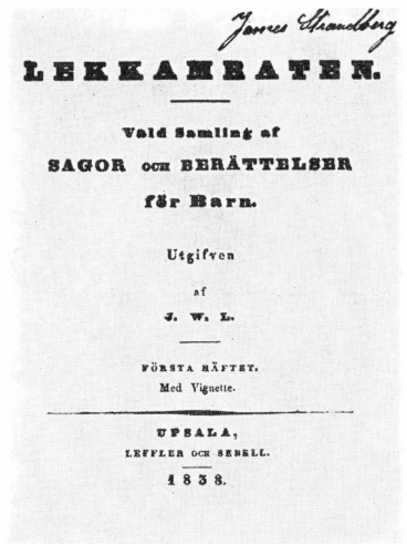 En særlig interesse knytter sig imidlertid til en samling eventyr, oversat til svensk, fra 1838. Denne udgave, som Cai M. Woel — uden nærmere at gå ind på detailler — omtaler i sin H. C. Andersen-biografi, 1949, II, s. 69 og 71 flg., udkom på slutningen af året 1838 under titlen: Lekkamraten. Vald Samling af Sagor och Berättelser för Barn. Utgifven af J.W. L. Första Häftet. Med Vignette. Upsala, Leffler och Sebell. 1838. (se Ill.) Foruden „Hans och Greta” og „Den Fattige och den Rike” af Brødrene Grimm, „Fågelboet” af Schmidt og „Rübezahl” efter Musäus udgøres indholdet af 5 af H.C. Andersens Eventyr: „Tumme-Lisa”, „Rikepelle och Fattigpelle” (Lille Claus og store Claus), „Reskamraten”, „Lilla Idas blommor” og „Elddonet” (Fyrtøiet). Bogens format, 10 x 14 cm, er ikke stort større end den første, danske udgave af „Eventyr fortalte for Børn”; H.C. Andersens navn anføres i indholdsfortegdelsen kun som: Andersen.