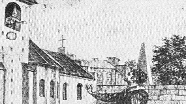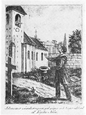 For det andet er dens „Vignet” den tidligste illustration til H.C. Andersens eventyr. Billedet[11] er en illustration til „Reise-kammeraten”, den scene, hvor, som den svenske tekst under billedet lyder, „Johannes vänder sig om på vägen och tager afsked af Kyrke-Nisse”. Johannes er klædt i datidens for unge håndværks-svende brugte dragt, hvis snit fremtræder svensk præget, mens kirken med dens takkede gavl lige så vel kunde være dansk som svensk. Det har desværre ikke været muligt at fastslå kunstnerens identitet.