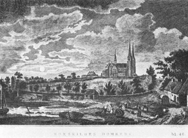 20. ^ Veelward, Abraham (1792—1873), hollandsk Kobberstikker. — I „Denmark delineated” by A. Andersen Feldborg. London, 1824, findes det selv samme Stik af Roskilde Domkirke („Roskilde Cathedral, painted by Prof. Dahl”) sammen med en halv Snes lignende, kendte Bygningsværker, stukket af W. H. Lizars efter Gengivelse af især danske Kunstnere. I 1826 oversattes Bogen til hollandsk og udkom i Haarlem under Titlen „Denemarken in Taferelen”, dog kun med 3 af Illustrationerne: Kronborg, Sorgenfri og „Roeskildes Domkerk”, uden Ændring paany stukket af Abr. Veelward, og Pladen til sidstnævnte er derefter benyttet til den anførte Ill. i den hollandske Udg. af „O. T.”, 1838 (medd. af Magister Victor Hermansen). „bl. 46″ under Billedet refererer til Sideantallet, hvor Roskilde første Gang nævnes i Bogen.