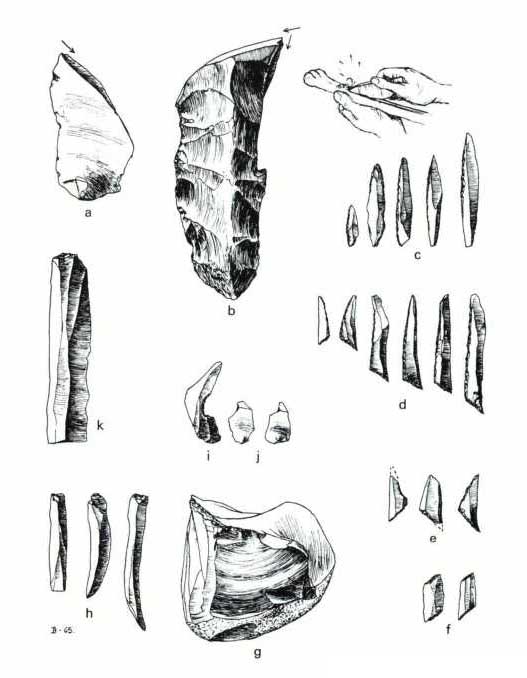 Redskabsinventaret er præget af små pile, mikrolitter, mikroflækkeblokke og redskaber af tak og ben ofte med en fin geometrisk ornamentik. Figur 2.