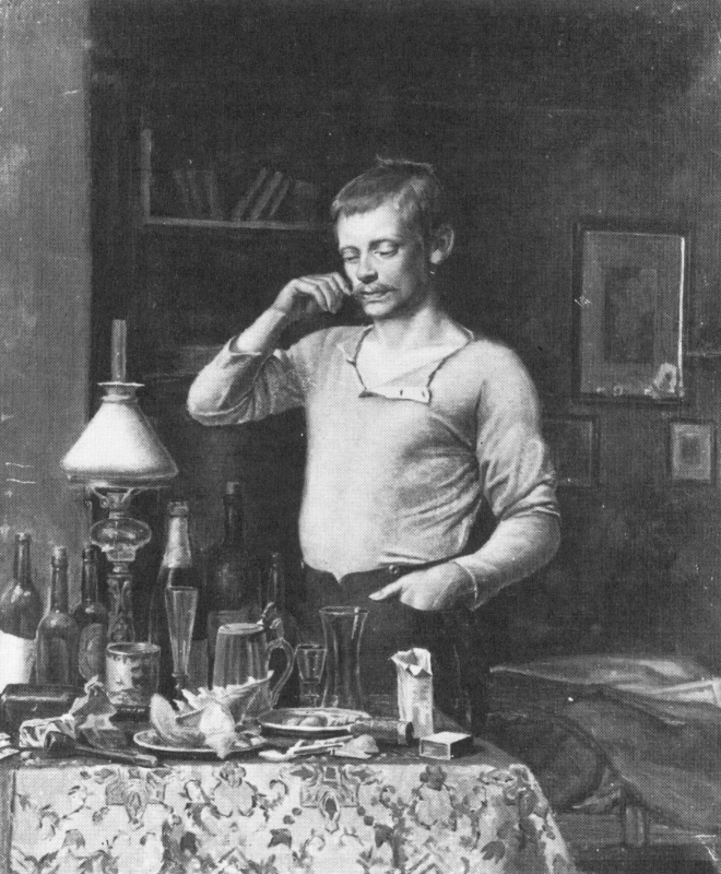 »Dagen efter et Sold« er selvportrættet, som Ærø Museum ejer. Det er skænket af frøken Margrethe Bruun, en af den lille byes virkelige damer. Hun holdt hus for distriktslægen, da han var blevet enkemand for anden gang. Billedet er 53 × 44 cm og viser maleren iført åbenstående, nusset undertrøje. Han stryger sig om overskægget, medens han med tunge øjenlåg betragter bordet, der flyder med tomme flasker, snavsede tallerkner og glas. I baggrunden en uredt seng.