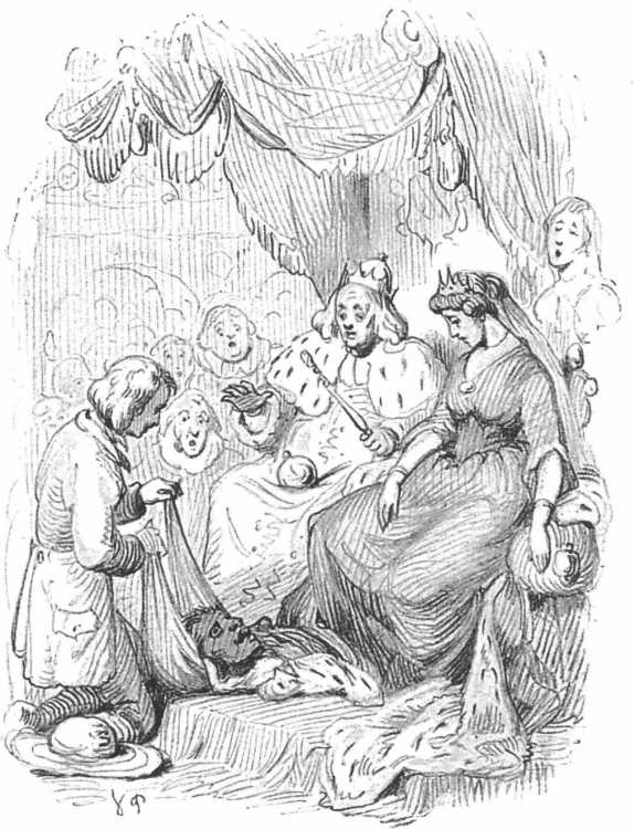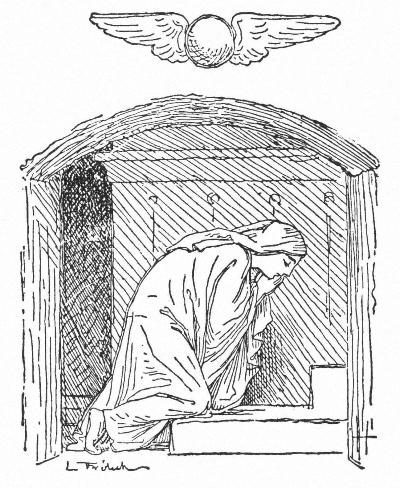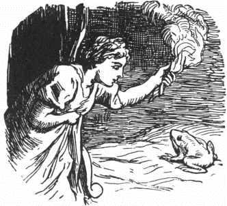… gjorde hun atter Korsets Tegn i Luften, mellem sig og den Døde, da bævede hendes Læber, da rørte sig hendes Tunge, og det Navn, hun oftest paa Ridtet gjennem Skoven havde hørt udsjunge og udtalt, blev lydeligt fra hendes Mund, hun sagde det: “Jesus Christ!” Da faldt Paddehammen, hun var den unge Deilighed;[29]