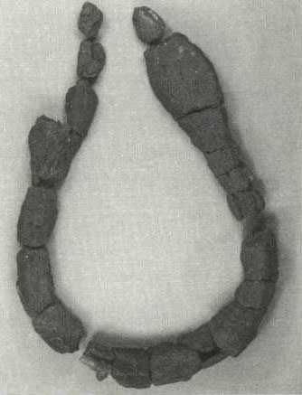 Oplægning af formrester til en "brillehalsring". Formen er brændt, men støbningen er mislykket. Formen viser, at ringen først blev vredet efter støbningen, både midterdel og afslutninger.