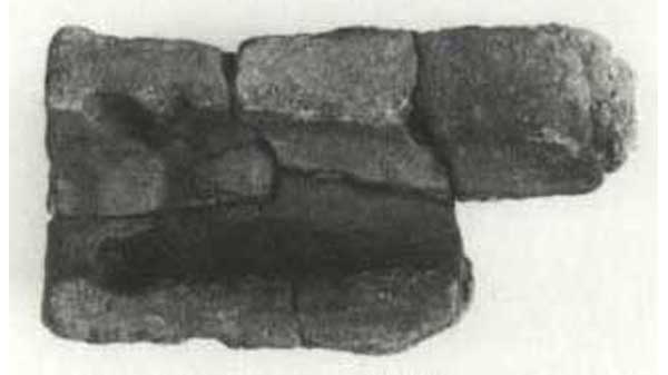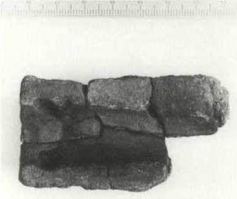 Tværsnit af den ene halvdel af en brugt støbeform fra Galgedil, hvor formens forskellige lag kan iagttages.