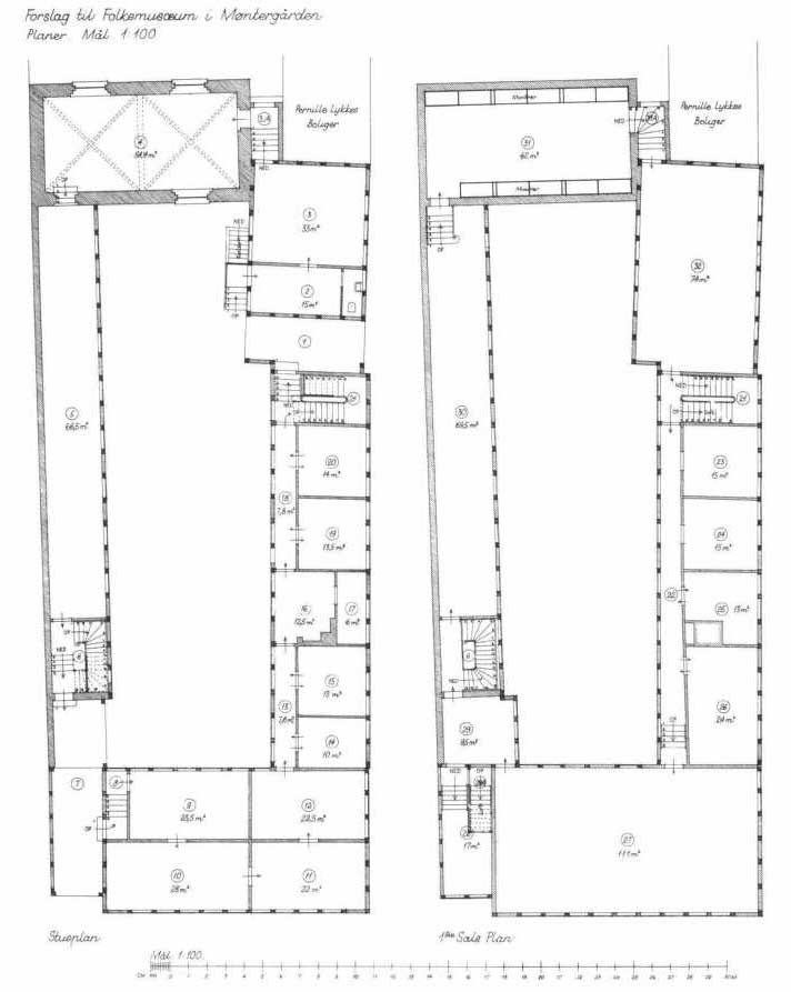 Forinden sidstnævnte forslag skal nærmere beskrives, må det understreges, at den ejendom, Odense kommune købte i 1930, kun omfattede hjørneejendommen – Overgade 50, Møntergården, matr. nr. 1834, altså ca. halvdelen af det areal, som i dag hører til Møntergårds-museet. Naboejendommen, Overgade 48, blev først erhvervet i efteråret 1939. Det projekterede nye folkemuseum11 var tænkt som et firlænget kompleks, hvori Møntergårdens Overgade-fløj og Møntestræde-fløj udgjorde den sydlige og østlige længe, idet dog sidstnævnte skulle forlænges yderligere med Eiler Rønnovs gård. Denne – altså Nørregade-forhuset – kunne netop klemmes ind mellem Møntestræde-fløjens nordgavl og Pernille Lykkes Boders sydgavl. Som nordlænge skulle nu opføres en grundmuret bygning med et gotisk hvælvet »kapel«, og i det vestlige ejendomsskel – ind mod Overgade 48 – langs en høj brandmur en lang smal »galleribygning«, til hvis forside man ville genanvende »forhåndenværende bindingsværk«. Det fremgår af korrespondancen, at man havde fået lovning på en endnu ikke nedrevet Assensejendoms sidelænge i bindingsværk. At den fredede Eiler Rønnovs gård kunne flyttes, havde man på forhånd sikret sig. Bygningssynet anbefalede det endda, med henvisning til den latente brandfare på den hidtidige plads.