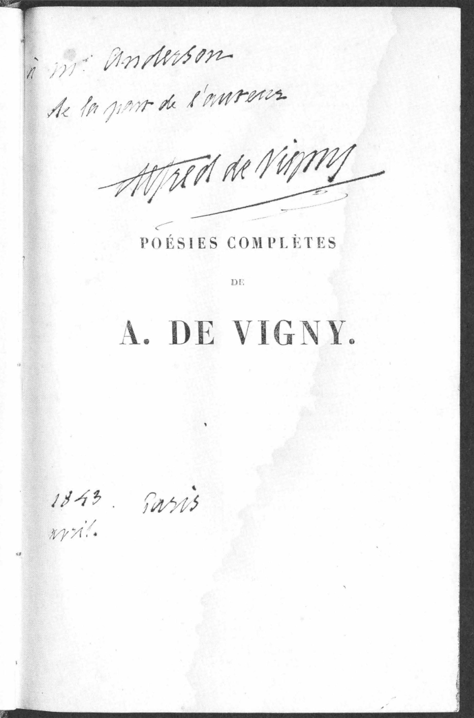 c) Arw. Aug. Afzelius: Afsked af Swenska Folks-harpan. Med bidrag till Swenska folksångarnas historie. Sthlm. 1848. Med forlæggeren Albert Bonniers dedik. til Skalden C. H. [!] Andersen. AA 325 Torst 2,10 kr. Bogh 711 pga. medløberen, P.D.A. Atterboms Svenska siare och skaldar, Bellman, 1852; om Atterbom se Album. – Lengertz, Malmö, kat. 114 nr. 45 1974, 450 sv.kr. S.a. i Byens Antikvariat, Kbh., pris ikke noteret. - ^ A. de Vigny: Poésies complètes. Paris 1841. På smudstitel: à M. Anderson de la part de l’auteur Alfred de Vigny. 1843 avril. Paris. AA 831 Aarup 1 kr. s.m. en anden bog. Odense. -sa.: Théâtre complet. Paris 1841. På smudstitel: à M. Anderson témoignage de haute estime – Alfred de Vigny. 26. av. 1843. Paris. AA 832 Aarup 1 kr. Odense. Vigny bragte bøgerne ved en genvisit, hvor han desuden returnerede A.s Album med et langt digt, se reg. til Album og Dagbøger II 354. – Odense 52/1966 og 74/1965. Se side 21.