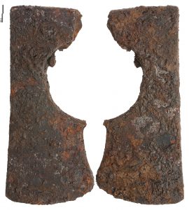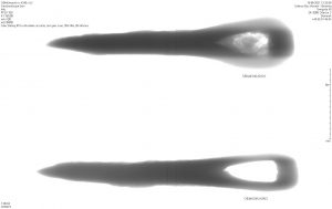 Røntgenfoto af de to øksers smalsider. Bemærk rester af skaftet i den øverste. Selv om økserne ser velbevarede ud, kan man godt fornemme, at dele af overfladen er opløst. Før de endte i åen, har de således været endnu tungere. Foto: Jannie Amsgaard Ebsen.