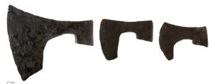 Tre af de fire økser, der er fundet i Odense Å ved Klaregadebroen i midten af byen. Foto: Nermin Hasic.