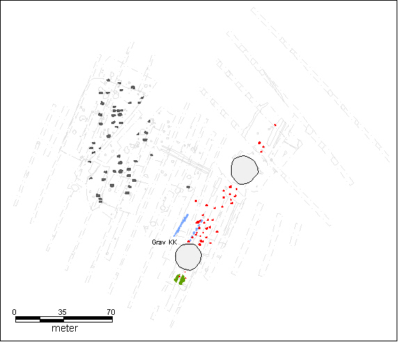 Grav KK er placeret umiddelbart op til nordsiden af den sydlige gravhøj og er en såkaldt urnebrandgrube, dvs. en grav, hvor urnen er nedsat i en større nedgravning, og hvor ligbålsresterne er placeret i såvel urnen som i nedgravningen heromkring (fig. 3). Gravgaverne har været med på ligbålet og består af dele af et bronzebånd, dele af en spinkel bronzestang med en del af en øsken, et ubestemmeligt bronzefragment samt en ørneklo med en gennemboring. Et par flintafslag og enkelte stykker keramik er antagelig ikke egentlige gravgaver, men skal snarere opfattes som tilfældige indslag af affald fra de omtalte bopladsspor på stedet. At gravgaverne er fragmenterede, skyldes formentlig en kombination af destruktion på ligbålet og en bevidst sortering af såvel de kremerede rester af afdøde som af gravgaverne og fragmenterne af disse. En sådan form for nedlæggelse kaldes en pars pro toto-nedlæggelse (nedlæggelse af en del frem for helheden). En lignende fremgangsmåde kendes fra andre grave på bronzealdergravpladsen og er heller ikke ukendt fra andre perioder af forhistorien. Med en del af genstanden, eller for den sags skyld afdøde, har man symboliseret hele genstanden eller hele individet.[9] Graven dateres til seneste del af yngre bronzealder (ca. 700-500 f.Kr.). Knoglerne af afdøde er bestemt til at være fra en 10 til 15-årig person, der, som det skal ses, på baggrund af gravgaverne kan bestemmes til at være af hankøn.[10]