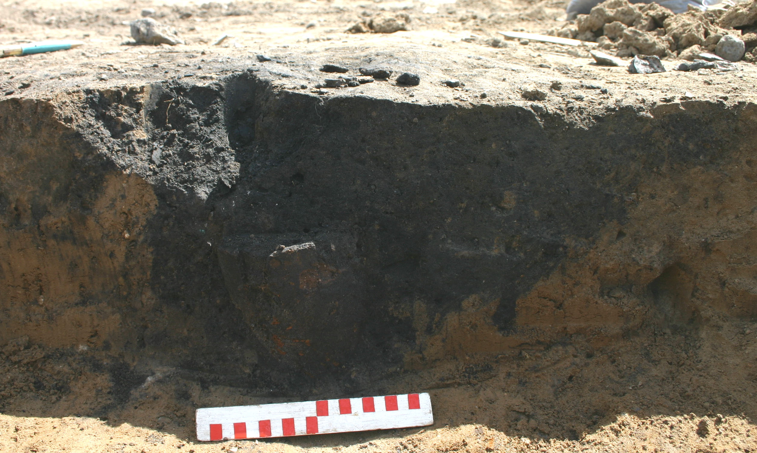 Udgående fra nordvest-delen af den sydlige høj ses to rækker af kogegruber. Rækkerne peger mod den nordlige høj og angiver en omtrent vestlig afgrænsning af gravpladsen. Kogegrubernes strukturerede placering indbyrdes og i forhold til gravpladsen viser, at anlæggene skal tilknyttes gravpladsen og ikke bopladsen. Kogegruberne er en form for jordovne, hvor man kan forestille sig, at måltider i forbindelse med gravlæggelserne er blevet tilberedt. Systemer af kogegruber på række, placeringen nær grave og rækkernes orientering mod eller tilknytning til gravhøje er fænomener, som efterhånden kendes fra en række lokaliteter.[6]