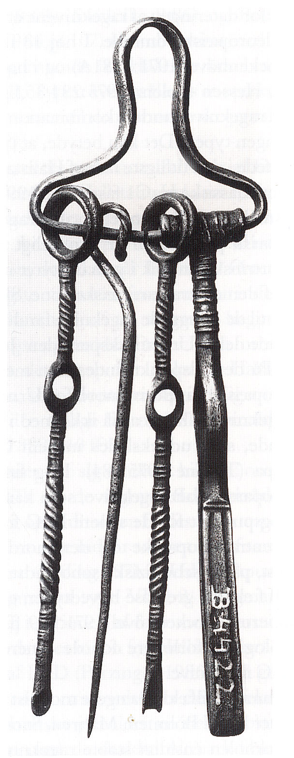 Bronzestangen med øsken er ca. 8,5 cm lang og ca. 0,3 cm tyk (fig. 5). Stangen afsluttes i den ene ende i en overbrudt øsken; i den anden ende er stangen også overbrudt. Stangens tværsnit er afrundet rektangulært, mens øskenen har et afrundet kvadratisk tværsnit. Fragmentet udgør antagelig en del af et fast sæt af toiletudstyr, bestående af pincet, neglerenser, syl samt øreske og med genstandene monteret på et bronzeophæng.[11] Monteringen på bronzeophænget foretages vha. et ringformet greb eller en øsken, svarende til den overbrudte øsken på stykket her (fig. 6). Toiletudstyret forbindes traditionelt med mandsgrave. Da den nedre del, funktionsdelen, ikke er tilstede, er det ikke muligt at bestemme, hvorvidt der er tale om en øreske eller en neglerenser