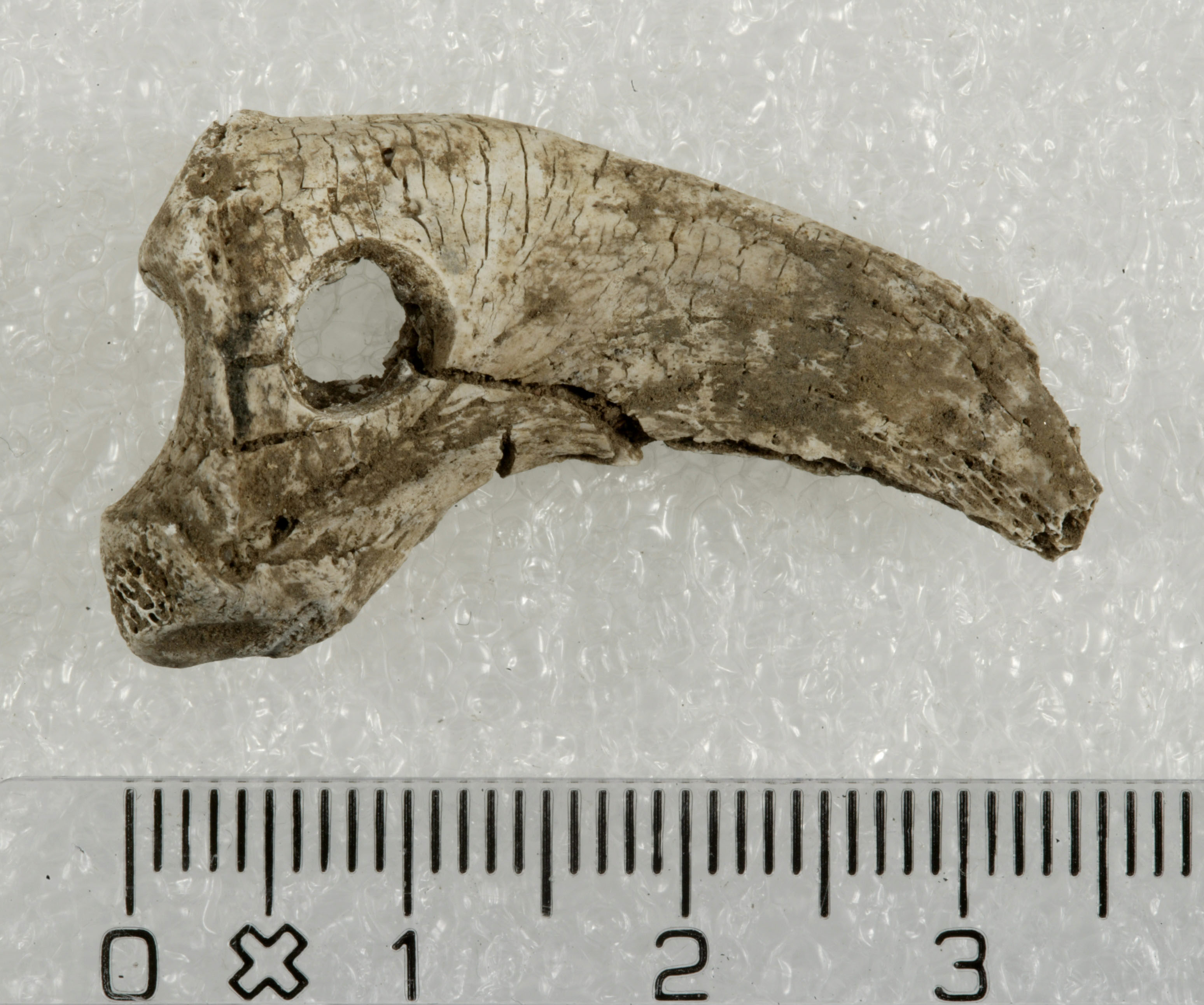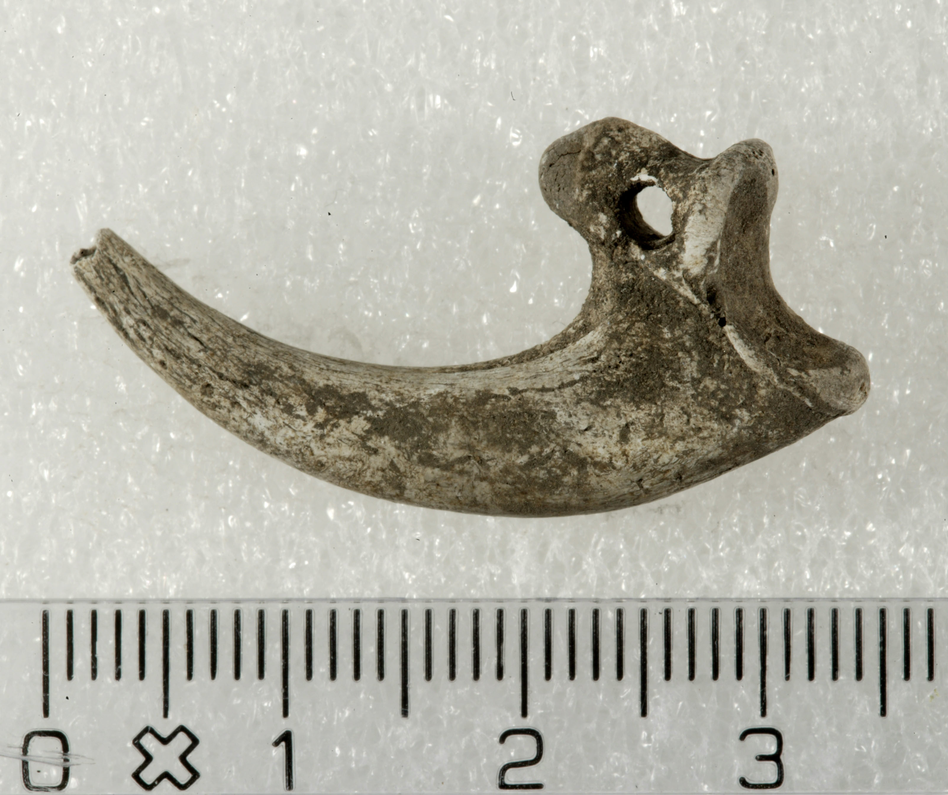 Ørnekloen er hvidbrændt, med undtagelse af den alleryderste spids fuldstændig bevaret og har en længde på ca. 3,5 cm (fig. 7). Tykkelsen varierer fra 0,2 til 0,5 cm, mens bredden varierer fra 0,3 til 1,5 cm. Kloen er en af de yderste tåknogler fra en havørn (Haliaeetus albicilla) eller en kongeørn (Aquila chrysaetos). Det er ikke muligt at give en præcis aldersbestemmelse af ørnen, men ud fra kloens størrelse må der være tale om et ungt eller modent individ.[12] Ved kloens “rod” ses en gennemboring med en diameter på ca. 0,2 cm. Gennemboringen er cylinderformet, hvilket viser, at den kun er foretaget fra én side. Mest sandsynligt er gennemboringen foretaget med et spinkelt flintbor. Kloen må have skullet hænge i en snor eller lignende og formentlig om halsen som en form for amulet.