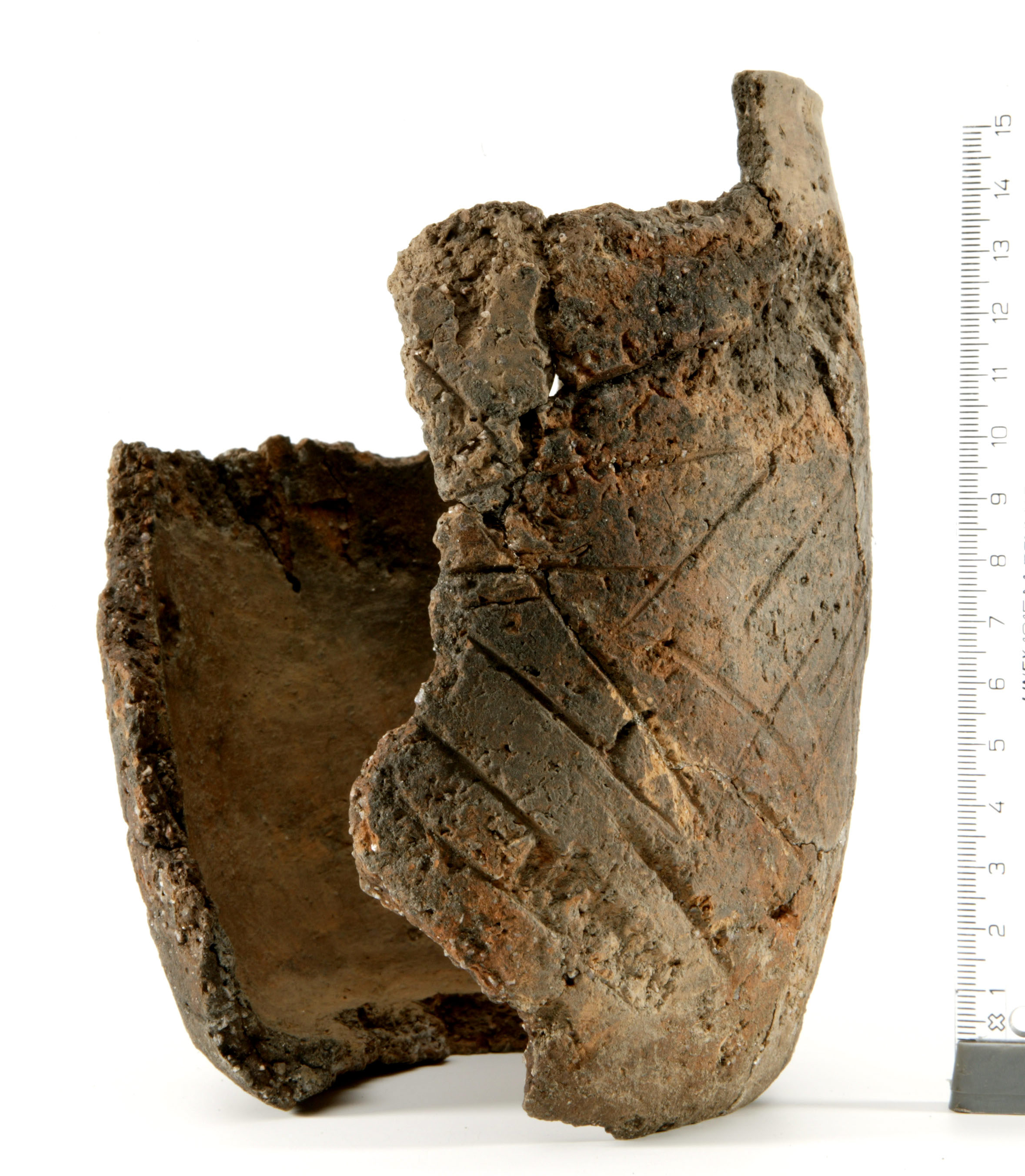 Urnen består af et ca. 17 cm højt lerkar med en diameter på ca. 12 cm (fig. 8). Godset er meget kraftigt ved bund og bug, hvor tykkelsen er ca. 0,6 cm, mens de øverste centimeter mod randen har en tykkelse på ca. 0,4 cm. Randen er kun bevaret over et ca. 5 cm langt stykke, ligesom størstedelen af bunden og dele af siderne mangler. Karret er enleddet med jævnt rundede til lodrette sider. Siderne har en grov overfladebehandling med undtagelse af de øverste få centimeter, der er glattede. Store dele af karret er ornamenteret med indridsede streger på kryds og tværs. Urnen er i øvrigt en af de mindste på lokaliteten. Måske der her er en sammenhæng mellem de relativt små knogledele fra et barn eller en ung mand i forhold til voksne individer?