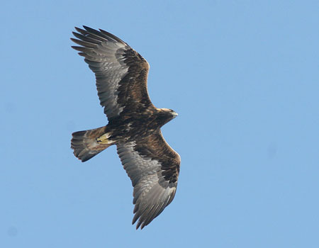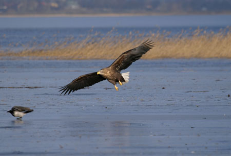 Havørnen er Europas største ørn med et vingefang på op til 2,65 m (fig. 9), og dens foretrukne biotop er lavvandede kyster, søer og fjorde. Føden består af ådsler, fisk, vandfugle og evt. mindre pattedyr. Reden placeres i et stort træ.[15] Kongeørnens vingefang er ca. 2 m (fig. 10), og dens foretrukne biotoper er bjerg- og skovrigt terræn, gerne nær moser og søer, alternativt ved klipperige kyster. Ungfuglene opholder sig om vinteren ofte på landbrugsarealer. Kongeørnen spejder efter bytte fra et højt punkt, f.eks, en trætop eller lignende, og jager med udgangspunkt derfra i lav højde over terrænet. Føden består af større ådsler, mindre pattedyr og fugle. Reden placeres på en klippehylde eller i et træ.[16] Vådområderne øst for Kildehuse II kan i bronzealderen have udgjort en velegnet indlands-biotop for både kongeørn og havørn, og ørnene kan således have fourageret nær lokaliteten. En anden potentiel biotop, Odense Fjord, ligger også inden for en overkommelig afstand fra Kildehuse II. En tredje mulighed er, at ornekloen er bragt til lokaliteten udefra.