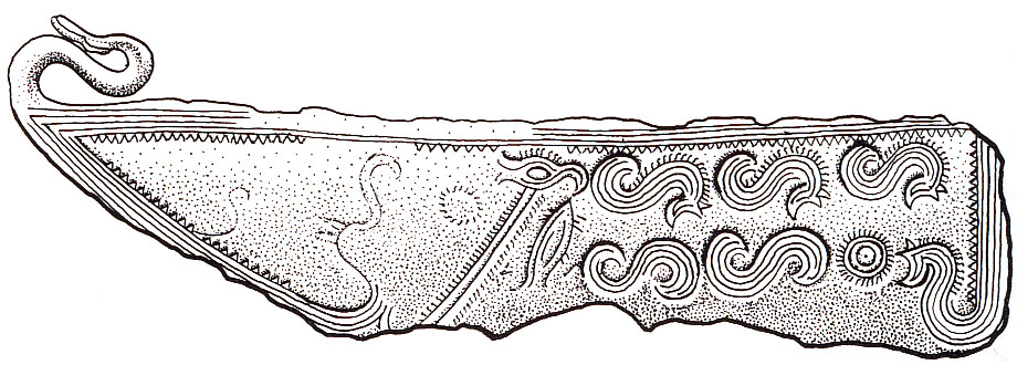 På baggrund af nyere analyser af bronzealderens righoldige billedverden på helleristninger og bronzer mener man, at religionen overvejende var centreret om solen og dens gang over himlen. En række motiver, såsom skibet, fisken, hesten, slangen og evt. fuglen, optræder i religionen som solens frembringere.[28] Dyrkelsen af solen afspejler en frugtbarhedskult eller måske snarere en dyrkelse af den mandlige virilitet. Sidstnævnte er også eksemplificeret ved en række fallossymboler i bronzealderens genstands- og billedverden; et forhold, som desuden fint modsvarer datidens mandsdominerede samfund med fokus på mandlige værdier som krig, kamp mv.[29] I denne forbindelse passer ørnens symbolske egenskaber, som det skal ses herunder, fint ind. Når fugle optræder i denne billedverden, er det dog næsten altid svømmefugle, men i enkelte tilfælde optræder også rovfuglen. På en ragekniv fra yngre bronzealder fra Torupgårds Mark ved Farsø i Nordjylland ses en rovfugl, der spiser fisken med den opgående sol (fig. 13). Rovfuglen menes på denne vis at symbolisere solens gang over nattehimlen.[30]