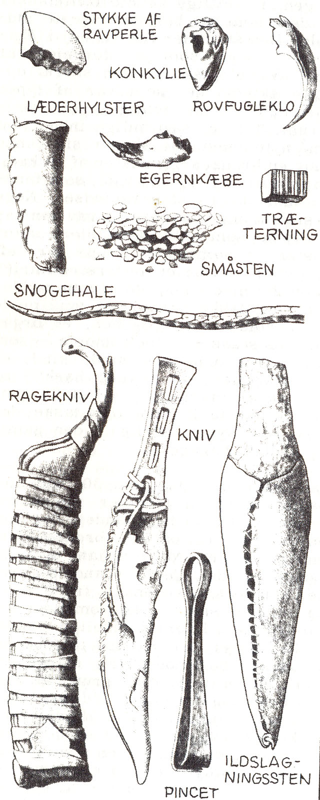 Fra ældre bronzealder (ca. 1700-1000 f.Kr.) kendes en række gravfund med små lædertasker, hvori afdøde – kvinder såvel som mænd – har haft personligt udstyr som fyrtøj og toiletsager. Herudover kan taskerne rumme en række mere specielle genstande som fiskekroge, pilespidser samt endelig en gruppe af genstande uden nogen egentlig værdi eller funktion. Sidstnævnte gruppe udgøres oftest af ting fra naturen, som f.eks. mineraler, stykker af dyr mv. Stykkerne kan i nogen grad være forarbejdede og kan være beviklet med snor e.l. Gruppen opfattes bedst som en form for amuletter og er endog af nogle tolket som tilhørende troldmænd eller shamaner. En af disse tasker, fra en mandsgrav ved Hvidegård nær Lyngby ved København, indeholdt bl.a. en rovfugleklo (uden bearbejdning) foruden i øvrigt en egernkæbe, en snogehale mv. (fig. 14).[31]