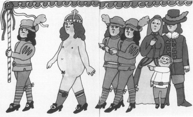 Det är barnet som utropar de förlösande orden: »Man han har jo ikke noget paa!«. Det oskyldiga barnets spontana kommentar återställer hos de vuxna tilltron till deras sinnens vittnesbörd. De vågar nu tro på vad de ser, befrias plötsligt från vuxenlivets hämningar och ropar som barnet »Men han har jo ikke noget paa!«. Ännu inte vana vid att direktkontakten mellan öga och tal, att säga det man ser, fungerar utan inbyggda villkor, upprepar de exakt barnets ord. Den verkliga originaliteten, ursprungligheten, finns hos barnet; det inskärper än en gång diktaren H.C. Andersen, när han beskriver de vuxnas »omvändelse«. Med små, diskreta medel genomför diktaren i sina berättelser sin plaidoyer för barnet inom sig, ofta genom att kontrastera det mot den vuxne. Kejsaren genomför processionen. Han påtar sig att spela narrollen, går in i den med kejserliga åthävor och för på så sätt upp den på ett plan, där han i sin tidigare kejsarvärdighet hörde hemma. Han blir sitt folks störste narr, ett praktfullt åskådningsexempel för alla, men genom sin öppna bekännelse av sin narraktighet vinner han till slut en smula sympati. Man vill gärna se en glimt av självironi i hans blick i slutet av processionen, en glimt av försonande humor som förenar honom med de kringstående vuxna. Det är ögonblick av klarsyn, när vi genomskådar vuxenhetens alla självbedrägerier och ser oss själva nakna som barn.