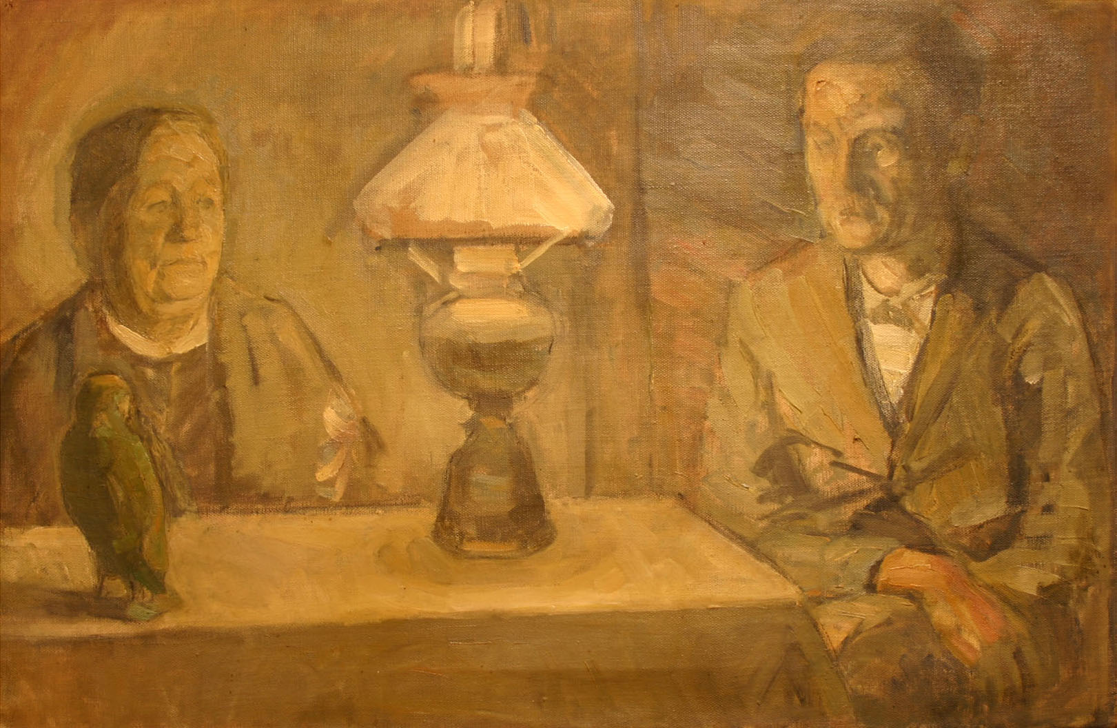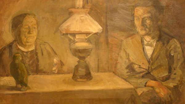 I portrættet af forældrene, er det imidlertid ikke lyset, der spiller den store rolle, selvom hele billedets tone er bestemt af det matte gyldne skær fra petroleumslampen midt på bordet.