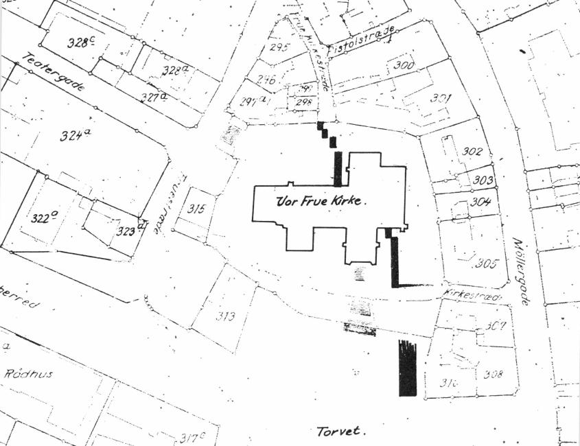 På vej ned gennem de fundrige middelalderlag bekræftedes følgende oplysning hos Joachim Begtrup[10]: „Kirkegaarden omgive kun Kirken paa de tre Sider, mod Østen støder den tæt op til en Kjøbmandsgaard, (det er matr. nr. 481 a og b.) hvis Grund i ældre Tider er kjøbt fra Kirkegaarden, da man ved Grundens Lægning til et Bryggerhuus fandt Liig.“